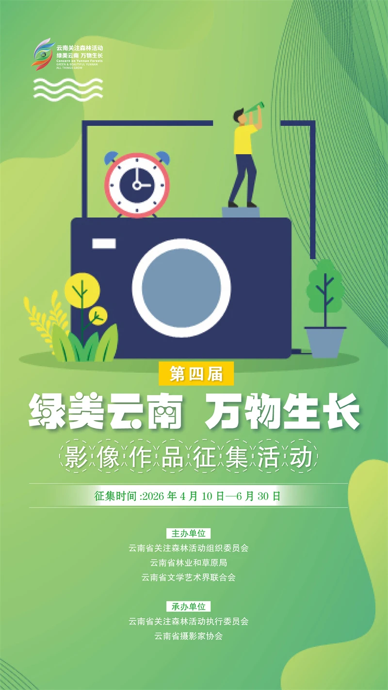 4月10日,第四届“绿美云南 万物生长”影像作品征集活动启动,旨在践行习近平生态文明思想,充分展示云南“动物王国”“植物王国”“世界花园”的独特魅力,通过影像艺术视角,讲述云南生物多样性保护的动人故事,呈现绿美云南万物生长的美好景象,传达人与自然和谐共处的美好愿望,展示“有一种叫云南的生活”的和美意象。
