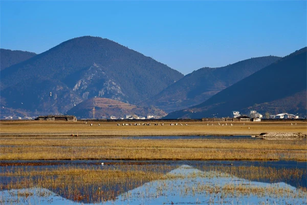能成为“飞鸟天堂”,纳帕海本身就自带底气。藏语里,它意为“森林背后的湖泊”,这片2083公顷的季节性沼泽湿地,藏着不为人知的温柔——夏季水泽盈盈,草木丰茂;冬季化作广袤草甸,成为候鸟们的“越冬家园”。