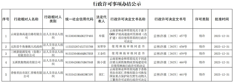 云南省林业和草原局行政许可事项办结公示(2025年12月31日)