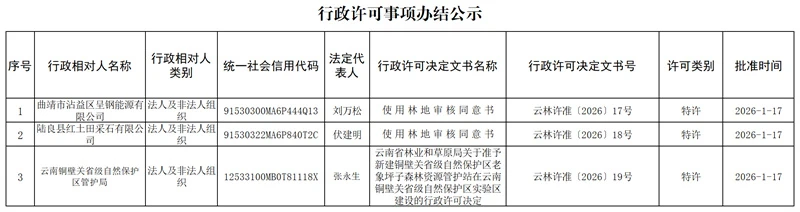 云南省林业和草原局行政许可事项办结公示(2026年1月17日)