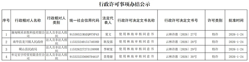 云南省林业和草原局行政许可事项办结公示(2026年1月24日)
