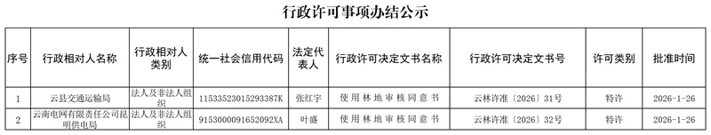 云南省林业和草原局行政许可事项办结公示(2026年1月26日)