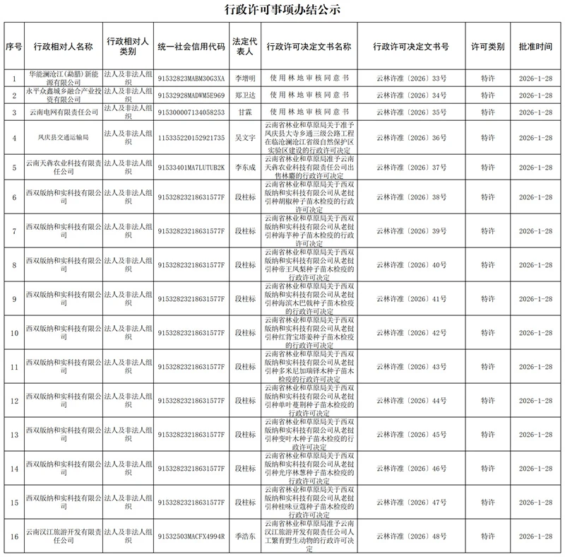 云南省林业和草原局行政许可事项办结公示(2026年1月28日)