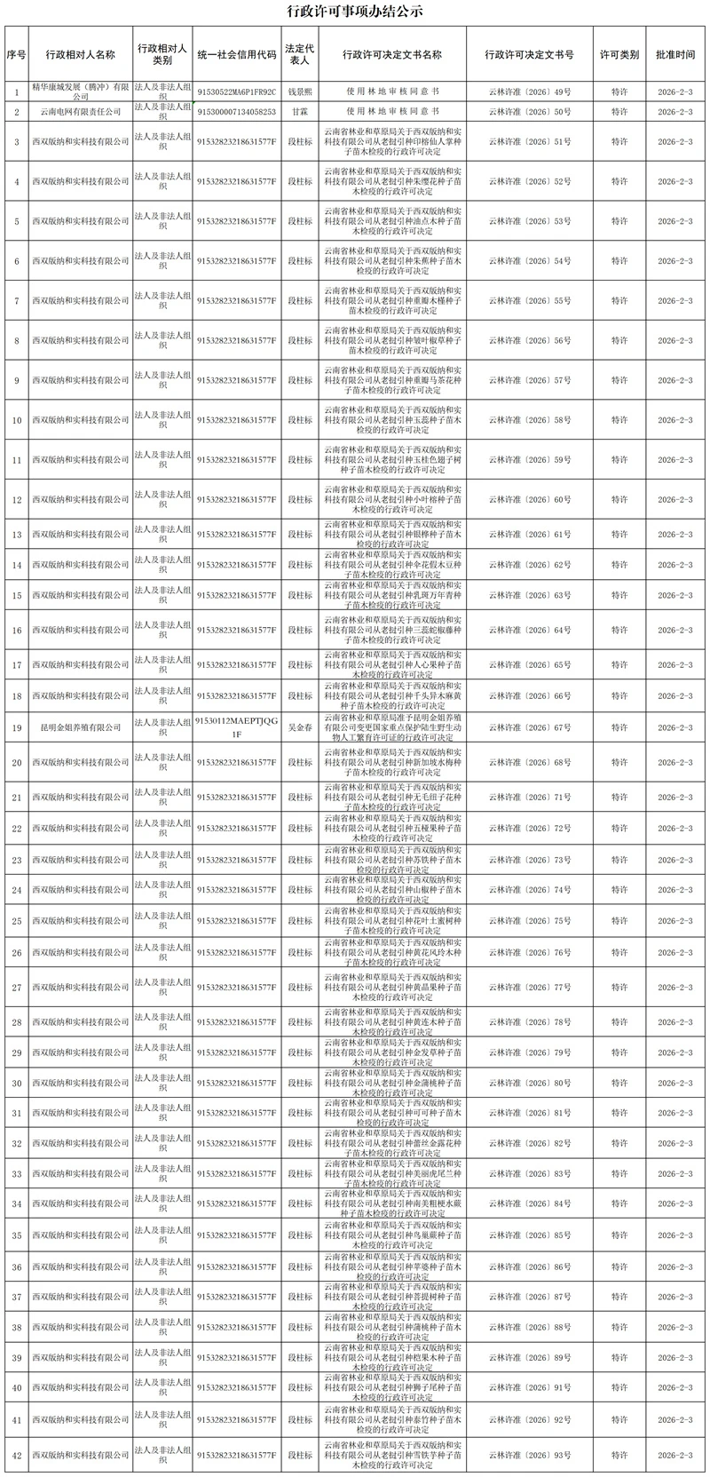 云南省林业和草原局行政许可事项办结公示(2026年2月3日)