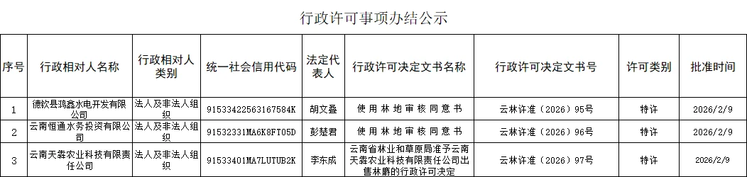 云南省林业和草原局行政许可事项办结公示(2026年2月9日)