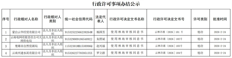 云南省林业和草原局行政许可事项办结公示(2026年2月24日)