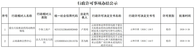 云南省林业和草原局行政许可事项办结公示(2026年3月26日)