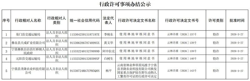 云南省林业和草原局行政许可事项办结公示(2026年3月27日)