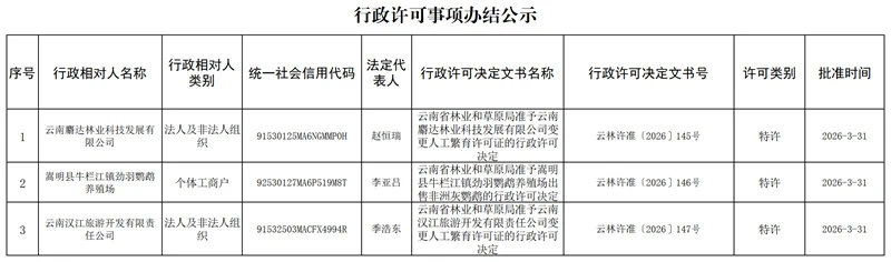 云南省林业和草原局行政许可事项办结公示(2026年3月31日)