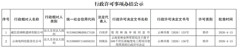 云南省林业和草原局行政许可事项办结公示(2026年4月15日)