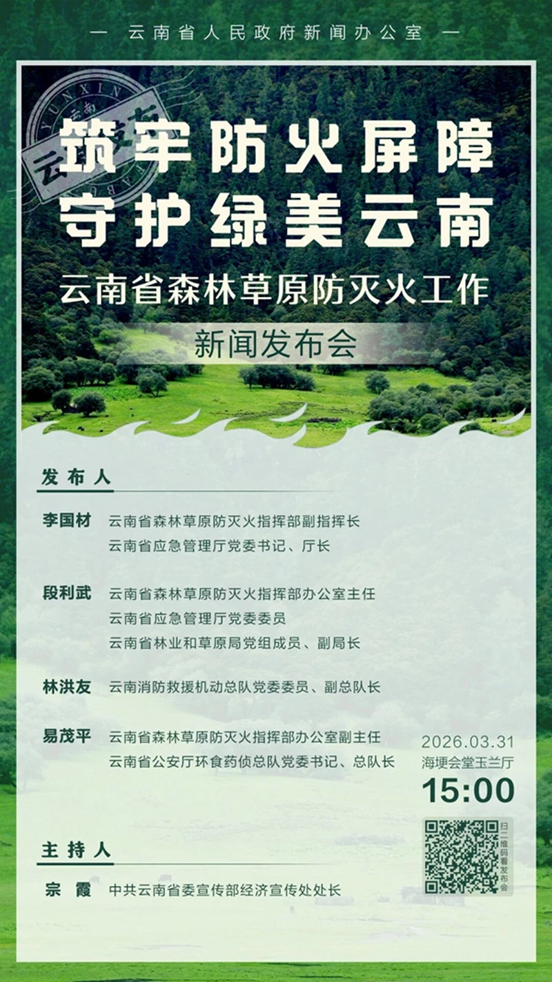 2026年3月31日下午,云南省人民政府新闻办公室在云南海埂会堂玉兰厅,举行云南省森林草原防灭火工作新闻发布会,邀请省森防指办公室(省应急管理厅)、省公安厅、省林草局、云南消防救援机动总队介绍全省森林草原防灭火工作情况并答记者问。
