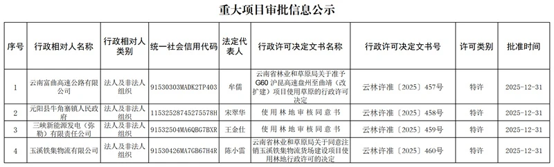 云南省林业和草原局重大项目审批信息公示(2025年12月31日)