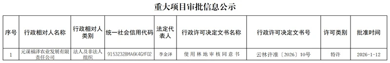 云南省林业和草原局重大项目审批信息公示(2026年1月12日)