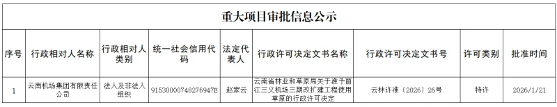 云南省林业和草原局重大项目审批信息公示(2026年1月21日)