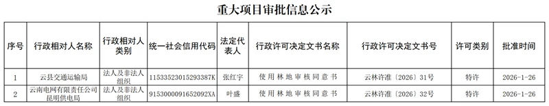 云南省林业和草原局重大项目审批信息公示(2026年1月26日)