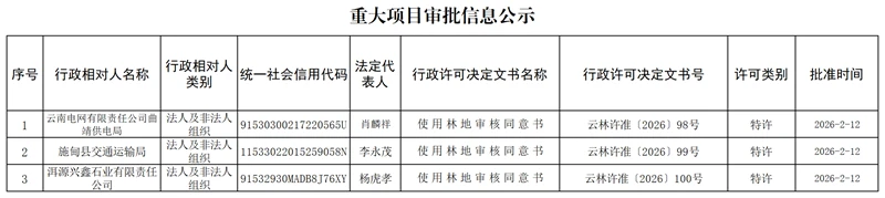 云南省林业和草原局重大项目审批信息公示(2026年2月12日)