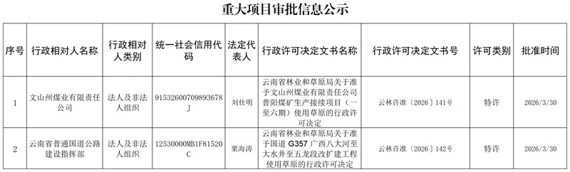 云南省林业和草原局重大项目审批信息公示(2026年3月30日)