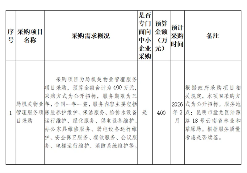 为便于供应商及时了解政府采购信息,根据《财政部关于开展政府采购意向公开工作的通知》(财库〔2020〕10号)等有关规定,现将云南省林业和草原局2026年1月至2026年2月政府采购意向公开如下: