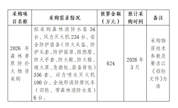 为便于供应商及时了解政府采购信息,根据《财政部关于开展采购意向公开通知》(财库〔2020〕10号)等有关规定,现将云南省林业和草原局2026年1月至2026年3月政府采购意向公开如下: