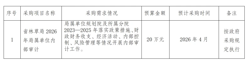 为便于供应商及时了解政府采购信息,根据《财政部关于开展政府采购意向公开工作的通知》(财库〔2020〕10号)等有关规定,现将云南省林业和草原局2026年3月—4月政府采购意向公开如下:
