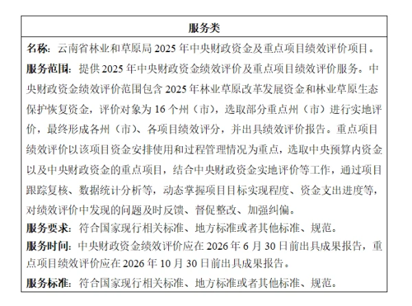 二、项目名称:云南省林业和草原局2025年中央财政资金及重点项目绩效评价项目
