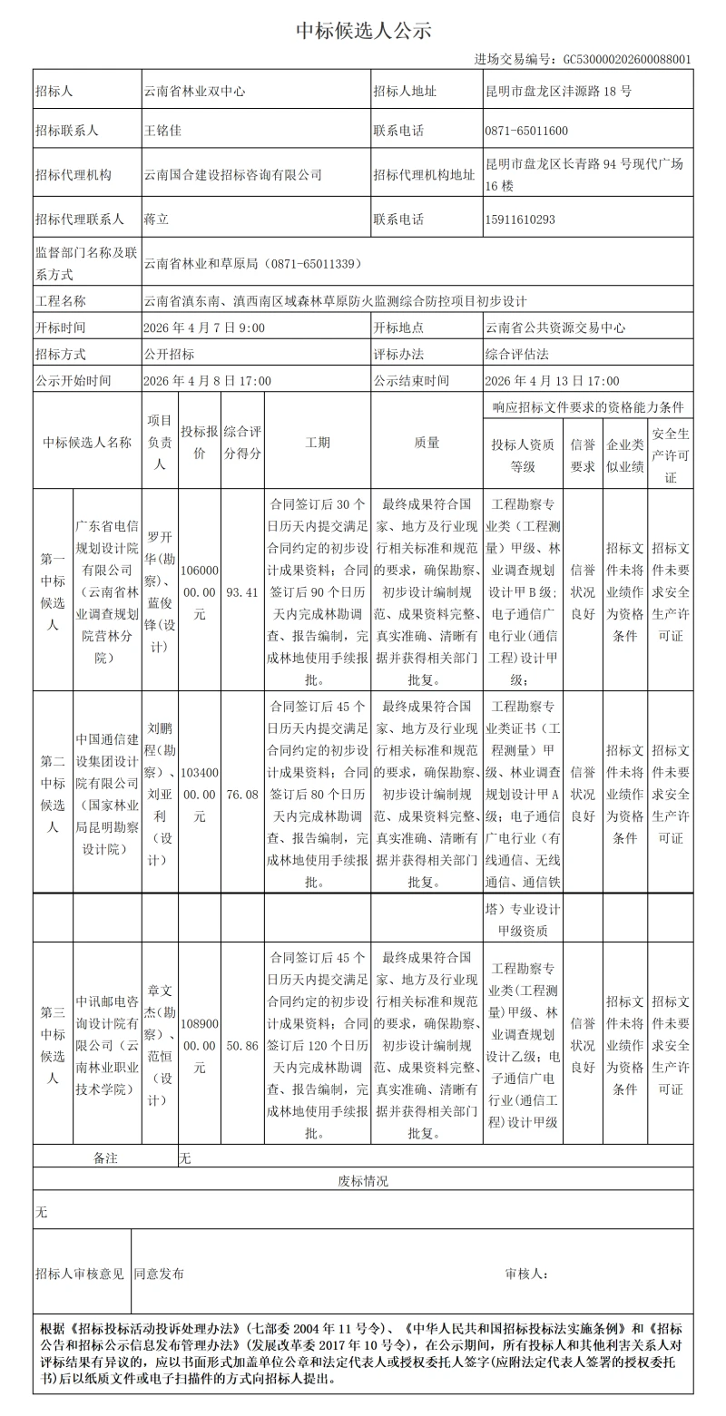云南省滇东南、滇西南区域森林草原防火监测综合防控项目初步设计中标候选人公示
