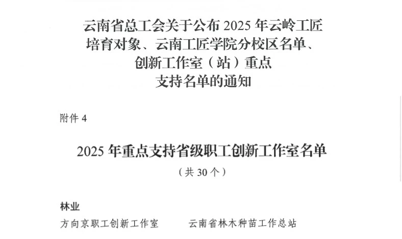 近日,云南省总工会公布2025年云岭工匠培育对象、云南工匠学院分校区名单、创新工作室(站)重点支持名单,云南省林木种苗工作总站方向京职工创新工作室成功获评,为全省林草系统再添一个重要的技术创新与人才培养平台。