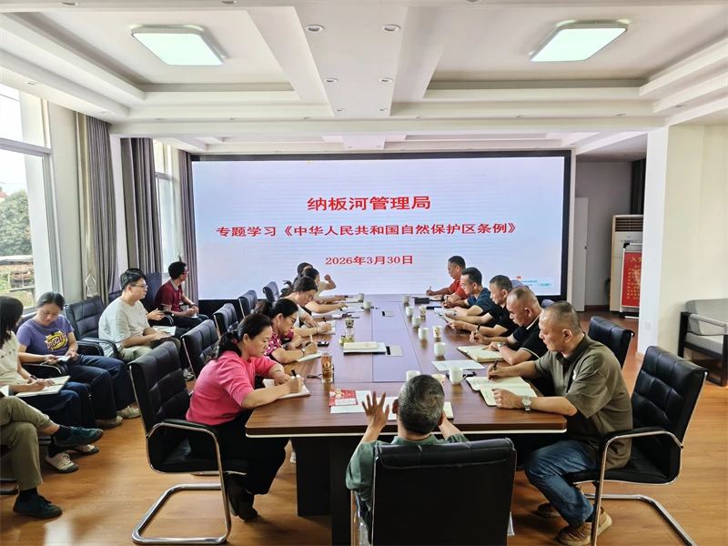纳板河管理局高度重视《条例》学习贯彻工作,将其作为当前和今后一个时期保护区法治建设的重要任务。新修订《条例》自2026年3月15日起施行,纳板河管理局第一时间组织召开专题学习会,局领导班子带头领学,全体干部职工参加学习。会议围绕《条例》修订的背景意义、核心要义、重点条款及新旧变化等内容进行系统解读,重点学习了核心保护区与一般控制区的分区管控规定、规划编制要求、准入审批程序、监督检查职责等关键内容。会议要求全体干部职工深刻认识《条例》施行的重大意义,准确理解其基本内涵和精神实质,切实将《条例》各项规定落实到保护区建设管理的全过程,不断提升保护管理水平。