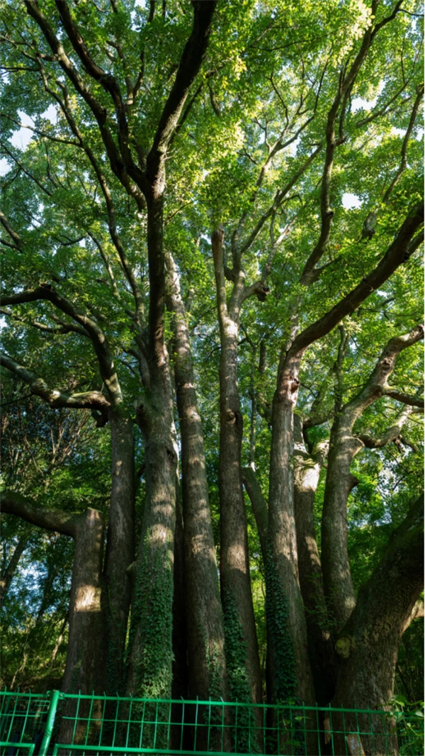 走近千年香樟时,映入眼帘的是巨大的树基——沟壑纵横、苍劲厚重,承载着千年岁月的沧桑与力量。庞大的树基上,奇迹般地分生出十余根笔直挺拔的树干,如同血脉相连的同胞,紧密相依却又各自奋发向上,直指蓝天。树皮青灰,光滑而充满生机,与古老的树基形成鲜明对比。枝干在高处相互交织,撑起一片巨大的绿色华盖。